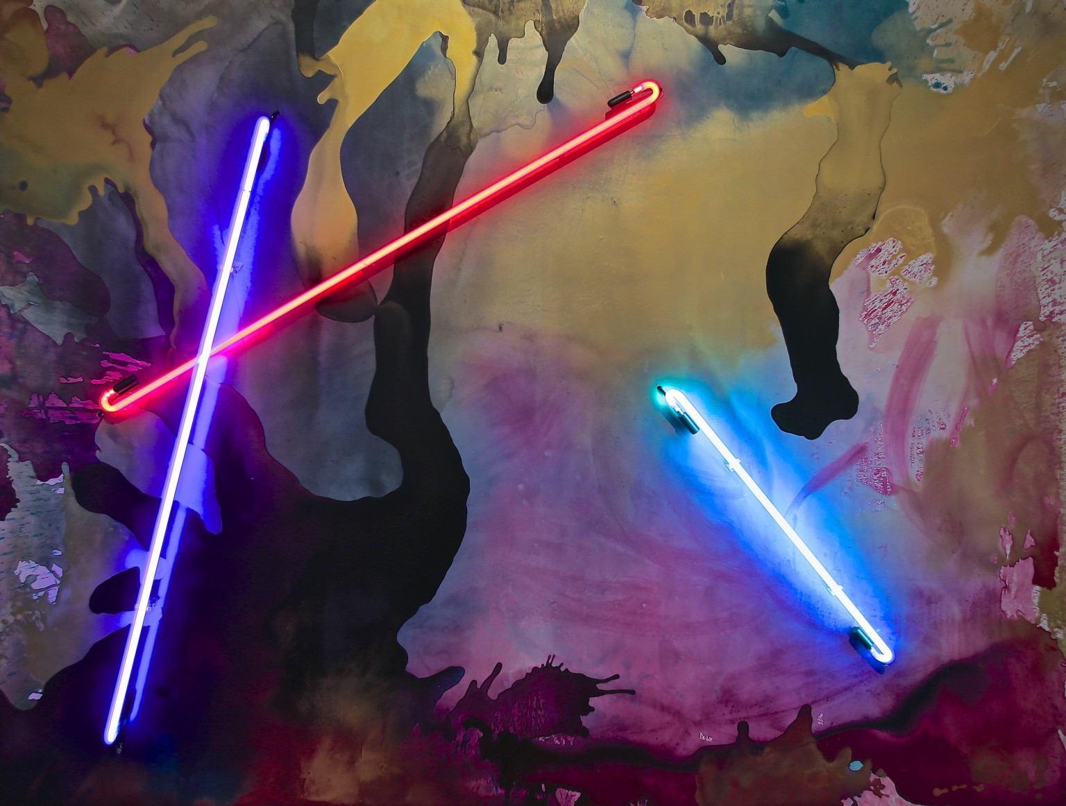 “I’m inspired by other things,” Axelrod says. “Nature, music, science, movies.” He points around at the work. “This is inspired by string theory, an astrophysics kind of thing.” He elaborates on the subject, that humans are all here randomly, without a grand plan or godly vision. He doesn’t know if this is fact, is entranced by the possibility. Hence, a body of work where neon tubing represents the smallest elements of the universe like atoms broadcasting their light over the “puddles of randomness” that they’re creating.